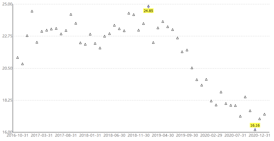 據(jù)國(guó)度郵政局?jǐn)?shù)據(jù),2020年宇宙快遞事跡企業(yè)業(yè)務(wù)收入累計(jì)完成8795.4億元,同比增長(zhǎng)17.3%,對(duì)應(yīng)單票收入10.55元,同比下落10.61%。順豐控股的單票收入從2018年高點(diǎn)的24.85元下落至18元下方。