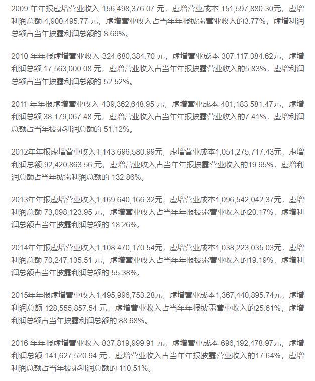 我們再望望這作秀的\"得益單\":13年里,累計虛增營業(yè)收入103.33億元,虛增營業(yè)成本93.99億元,虛增利潤總數(shù)9.34億元。更絕的是,有些年份虛增的利潤占總利潤的比例高達(dá)110%多。